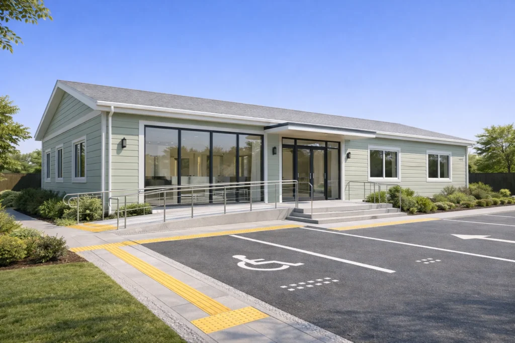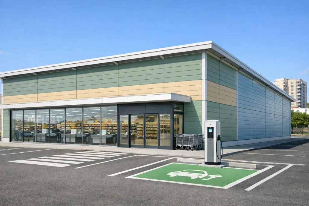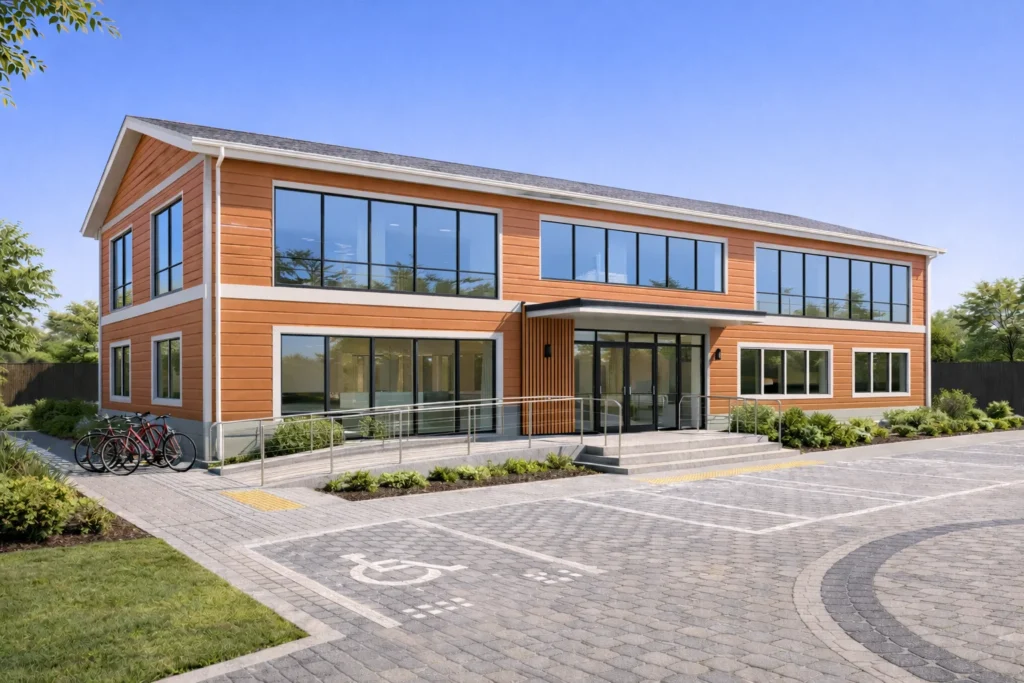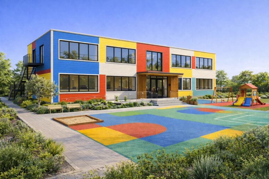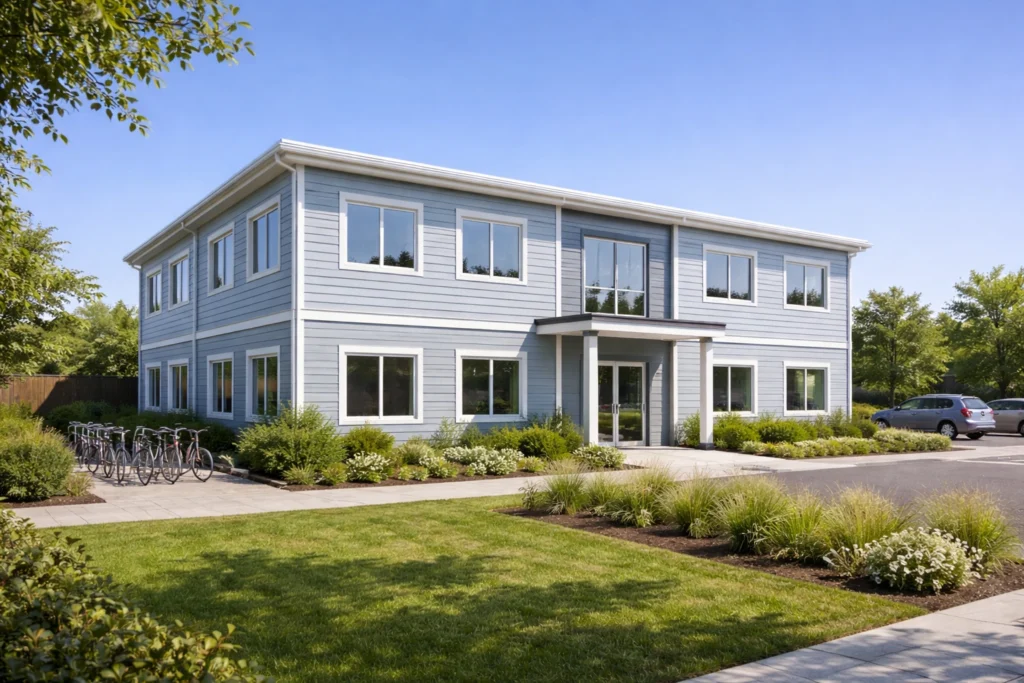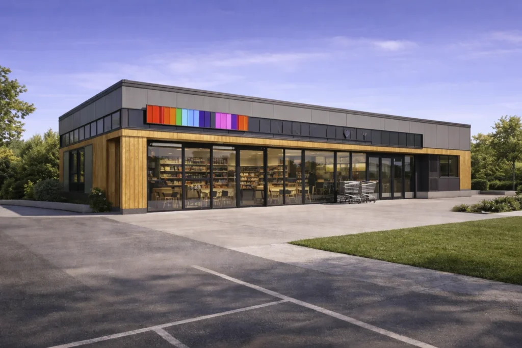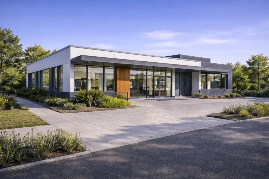 Sistem constructiv: pereți exteriori/interiori din panouri prefabricate, pe structură din oțel ușor, cu termoizolație din vată minerală și finisaj interior din gips-carton; fațade din fibrociment, tablă, lemn sau WPC; acoperiș prefabricat, termoizolat, cu membrană de protecție și învelitoare din tablă profilată; la clădiri cu etaj: planșee pe placă de beton.
