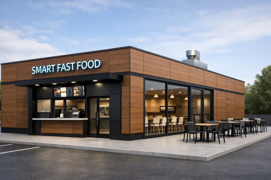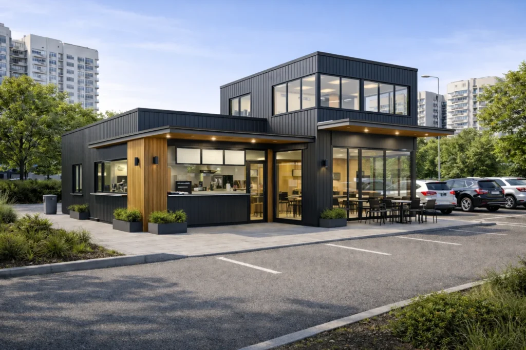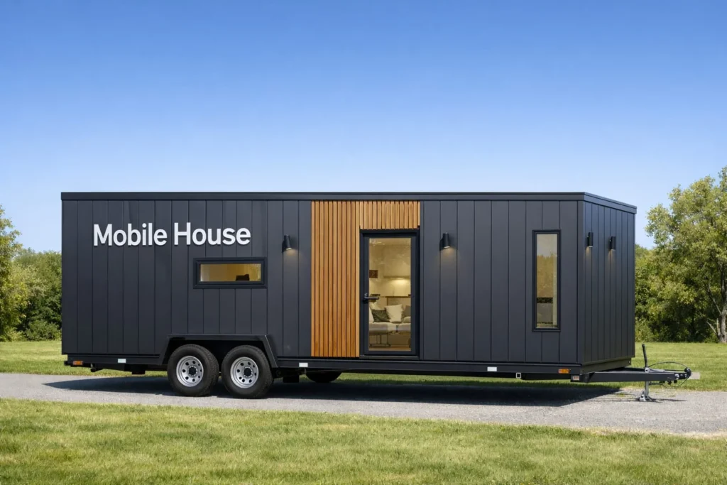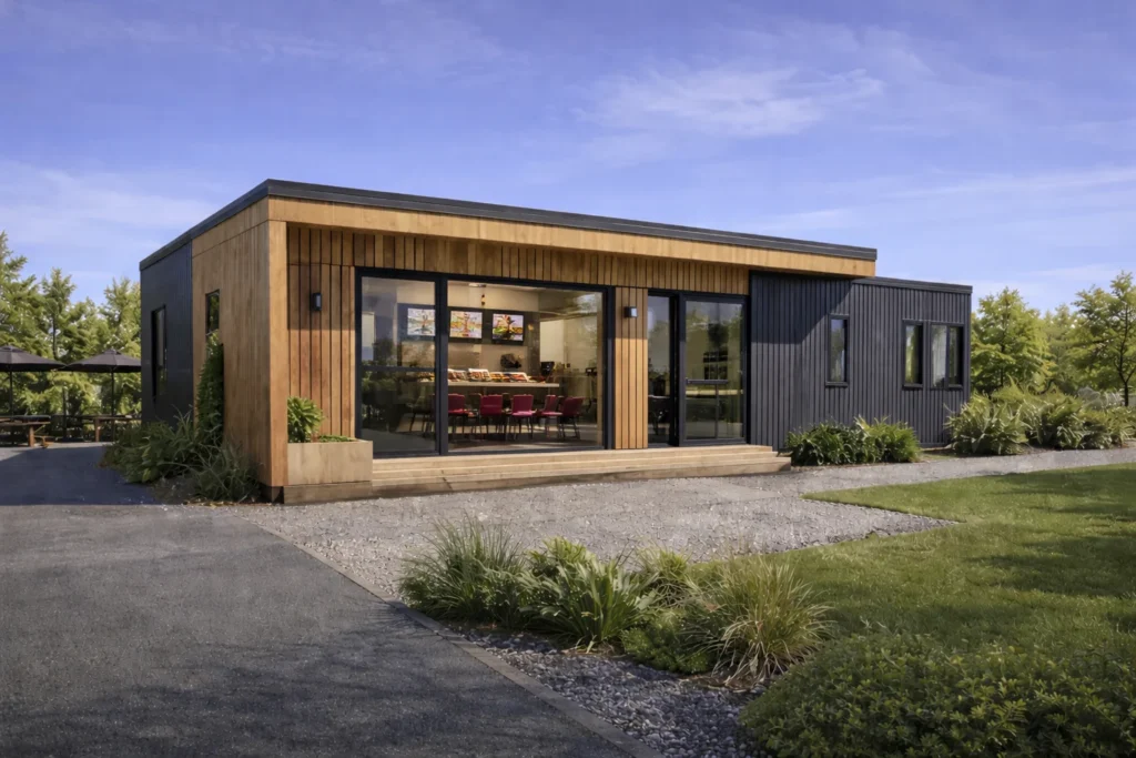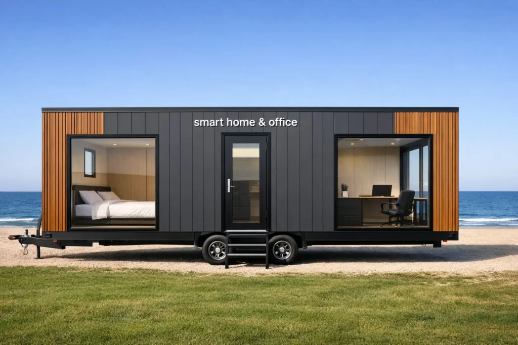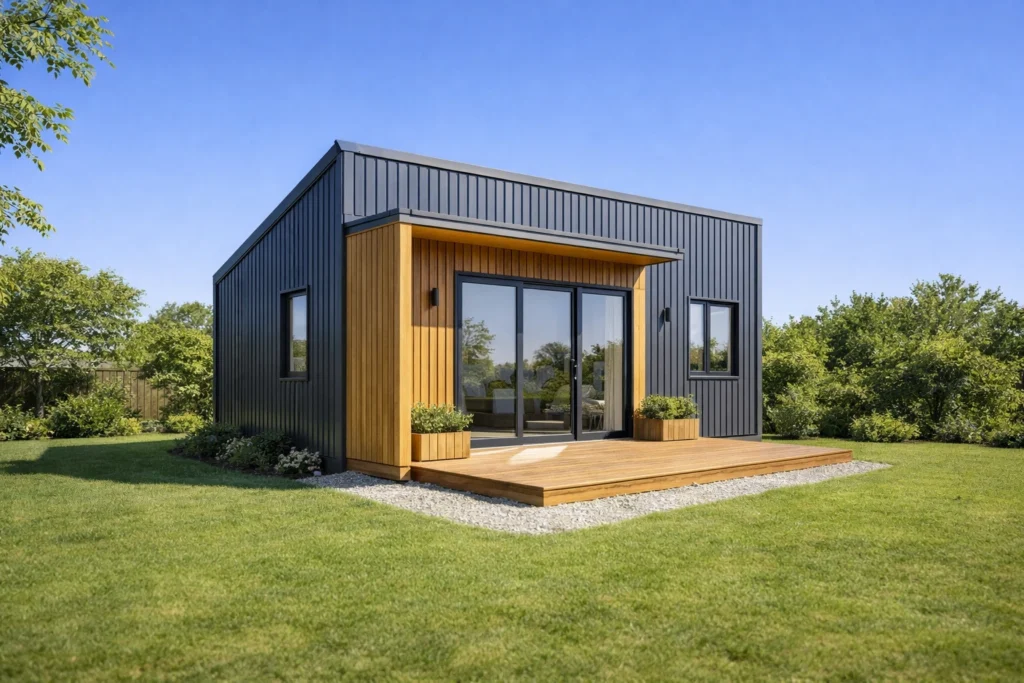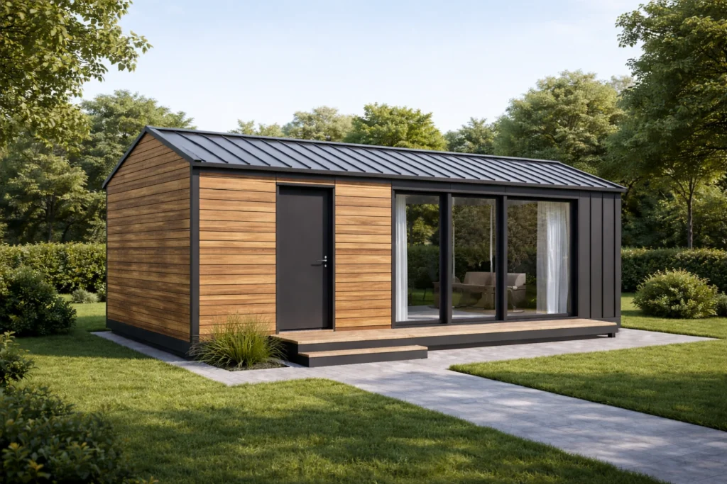Sistem constructiv: unitate modulară realizată în fabrică ca ansamblu complet; pereți exteriori/interiori pe structură din oțel ușor, cu termoizolație din vată minerală și finisaj interior din gips-carton; fațade din lemn, WPC sau tablă ; acoperiș termoizolat, cu membrană de protecție și învelitoare din tablă profilată; se livrează ca modul complet, opțional pe șasiu cu roți.