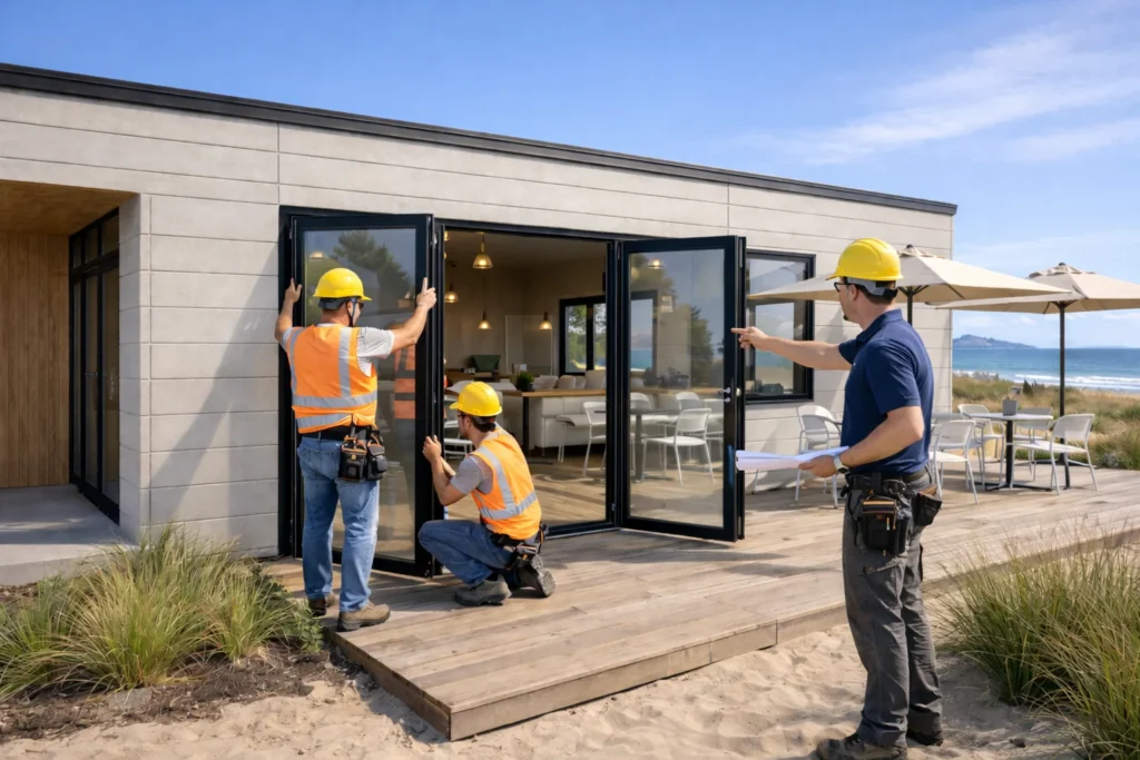 Ce montăm și conectăm pe amplasament: asamblare panouri prefabricate + elemente de rigidizare · etanșări și tâmplărie · instalații și punere în funcțiune · finisaje, conform pachetului ales.