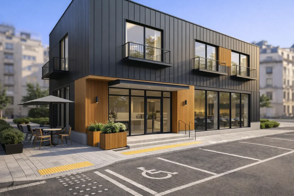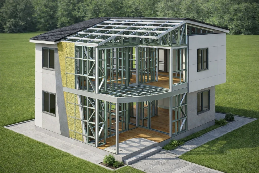 Oțel ușor: potrivit pentru clădiri permanente, inclusiv cu etaj, cu flexibilitate mare la proiectare și compartimentare.