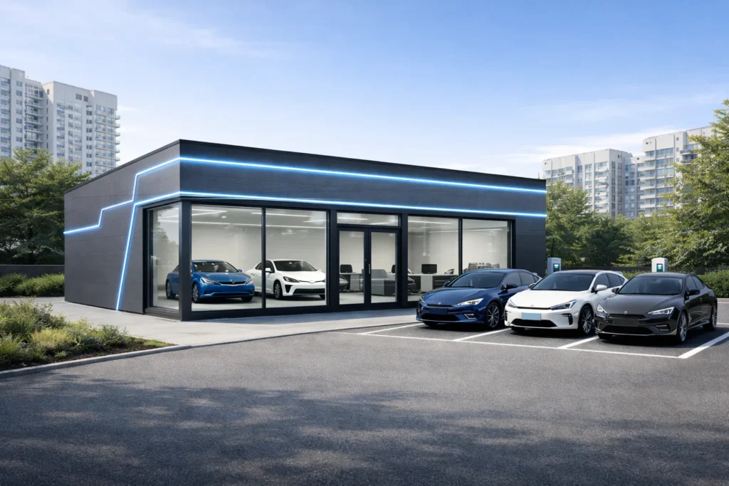 Nu. Este o construcție prefabricată, proiectată ca o clădire reală (locuință sau spațiu comercial), nu un container de marfă „amenajat”. Diferența stă în structură, izolație și durabilitate.